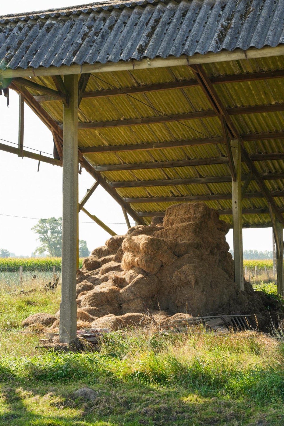 Wagenkot. Ten westen van het erf gelegen volume van één bouwlaag onder een pannen zadeldak (Vlaamse pannen).