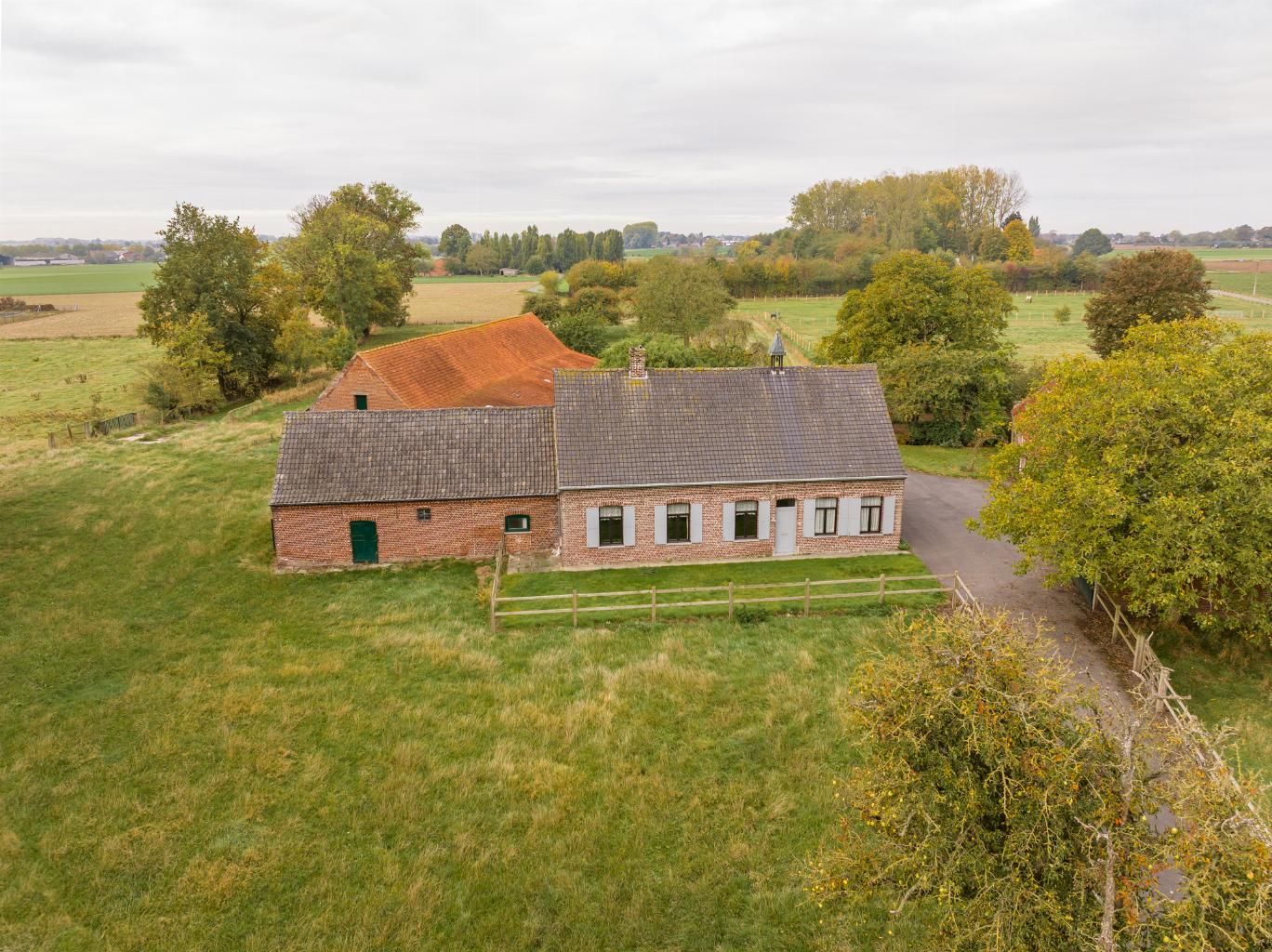 Via een private dreef van 50 meter komt u terecht bij deze authentieke hoeve. Deze eigendom wordt te koop aangeboden op een oppervlakte van 1 ha 17 a met mogelijkheid naar uitbreiding tot 2 ha 35 a.